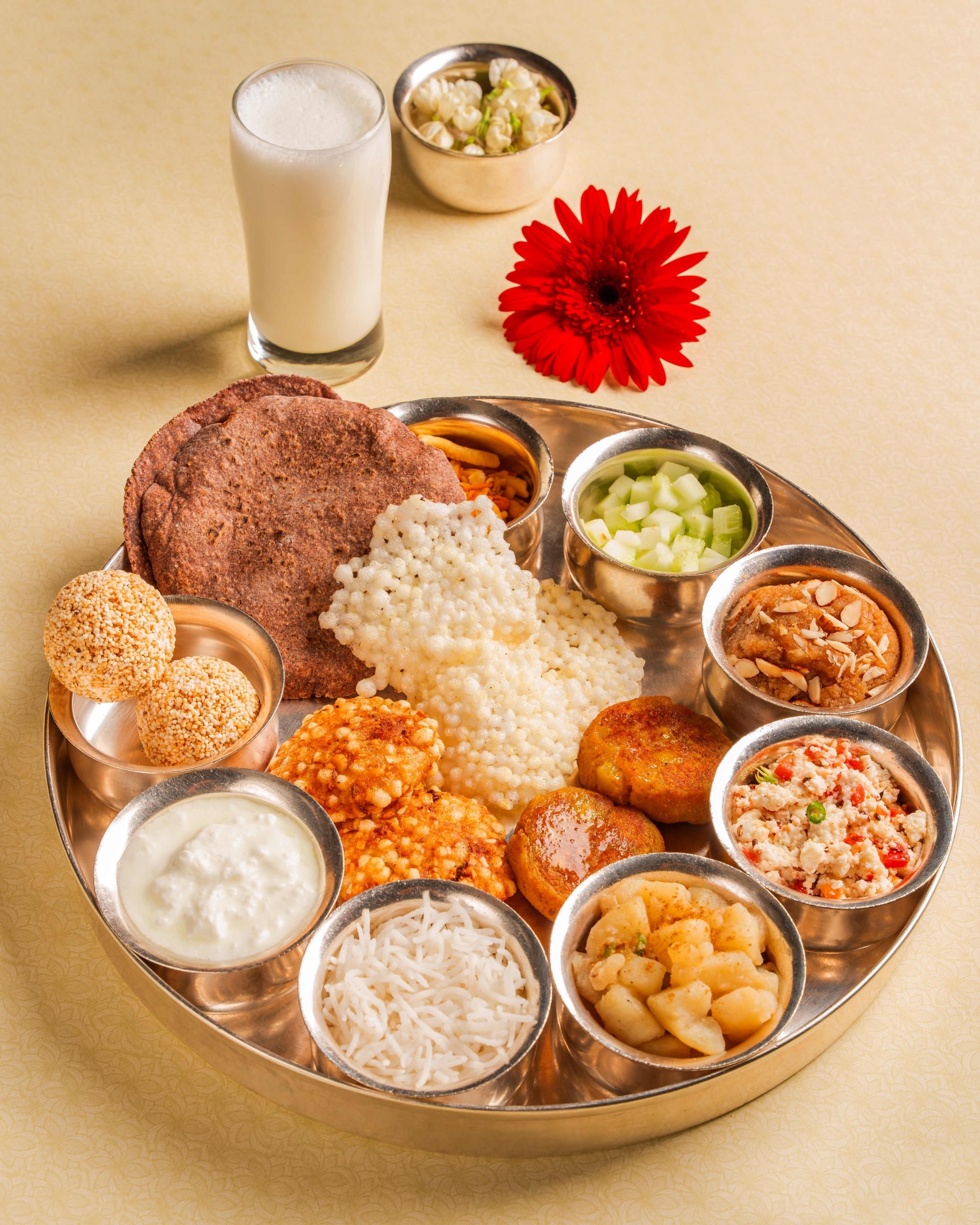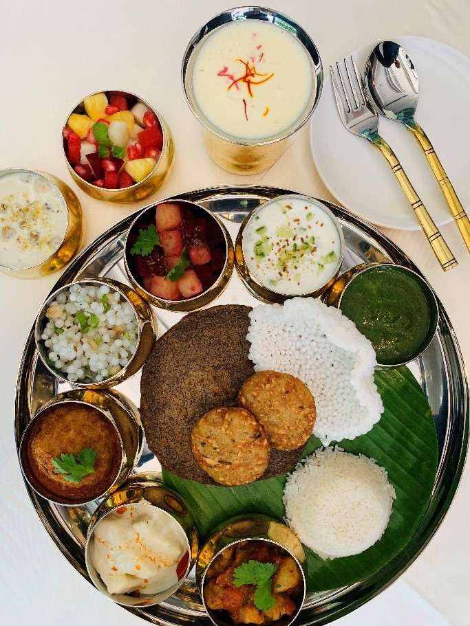 Root vegetables, millets, fruits, and dairy form the foundation, ensuring nourishment while supporting prayerful practices. Consciously free of tamsic foods that disturb inner peace, all preparations use sendha namak (rock salt), revered as pure and permissible for fasting rituals.