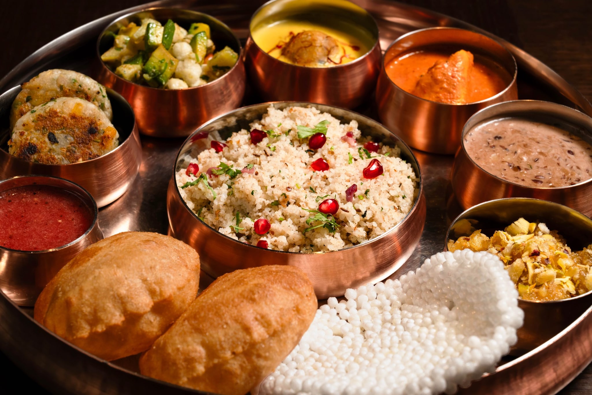 Adding a refreshing note are beverages like Kokum Sharbat, Chaas, and Piyush, while desserts bring a sweet close with Moong Dal Halwa, Sabudana Kheer, and Akhrot ka Halwa.